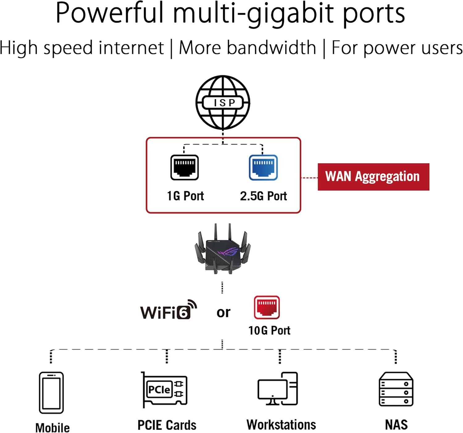 The ASUS ROG Rapture GT-AX11000 Pro is designed for gamers who want to keep multiple devices connected and still get incredible gaming performance. Enjoy up to eight simultaneous WiFi streams for more video streaming, gaming and browsing for everyone in your home. Disclaimer: Actual data throughput and WiFi coverage will vary from network conditions and environmental factors, including the volume of network traffic, building material and construction, and network overhead, result in lower actual data throughput and wireless coverage.